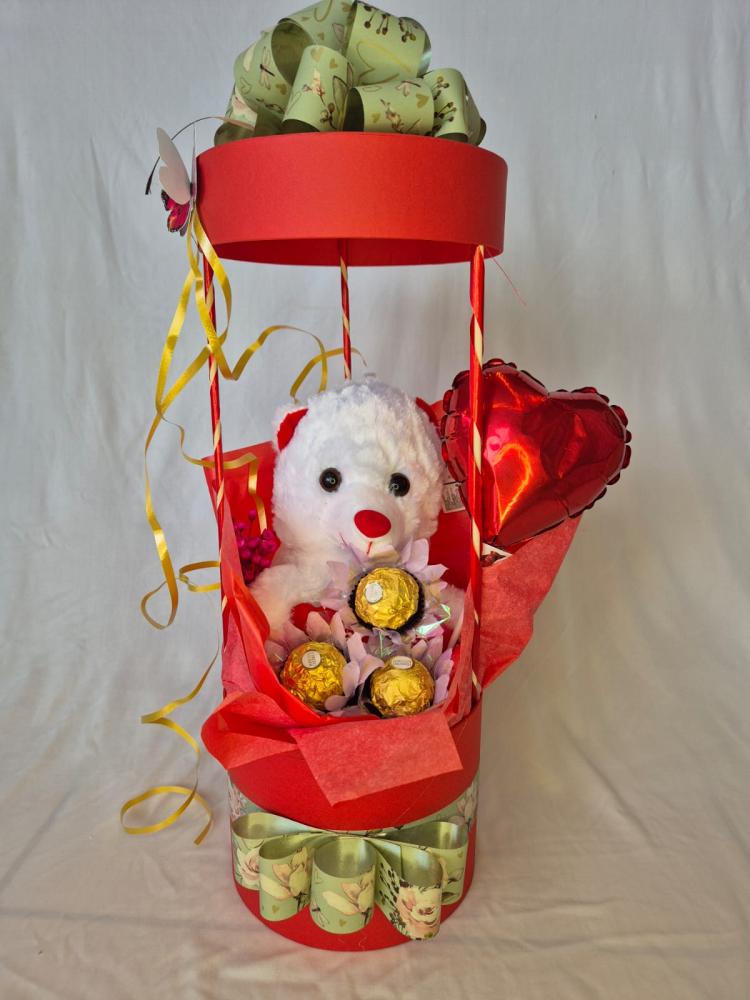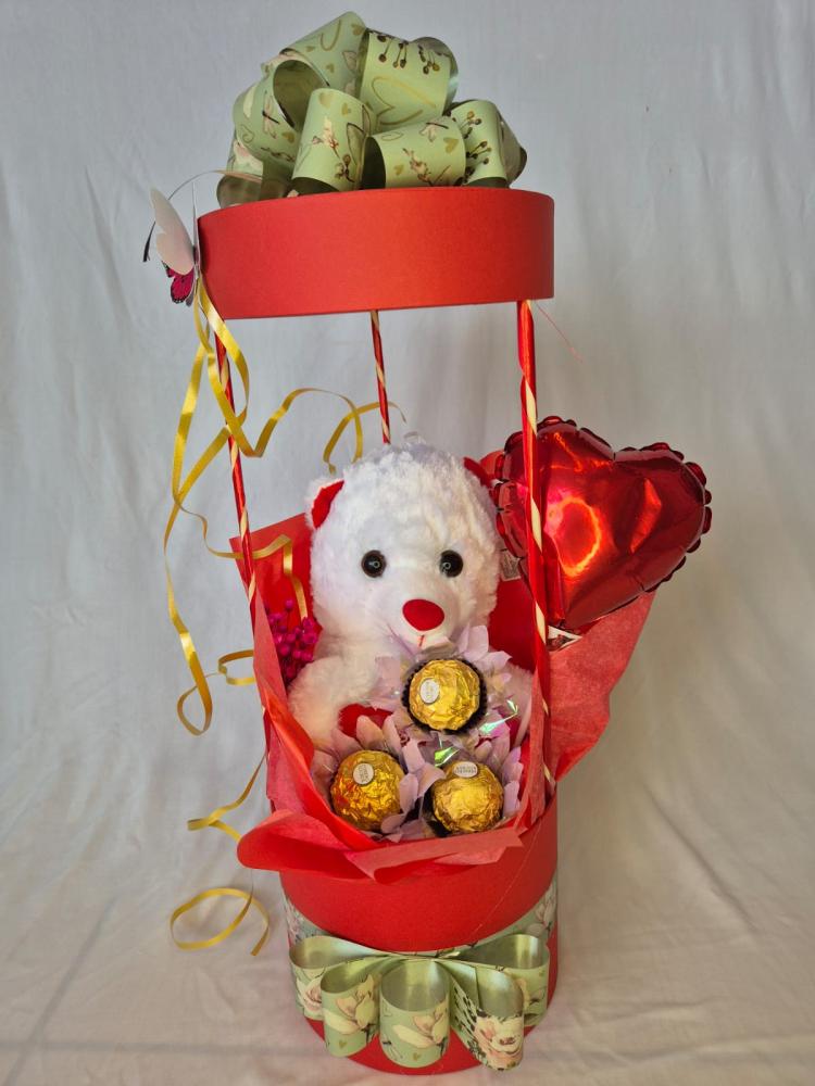 Caixa box contendo: Um Urso de Pelúcia,3 chocolates Ferrero Rocher e um Balão de coração