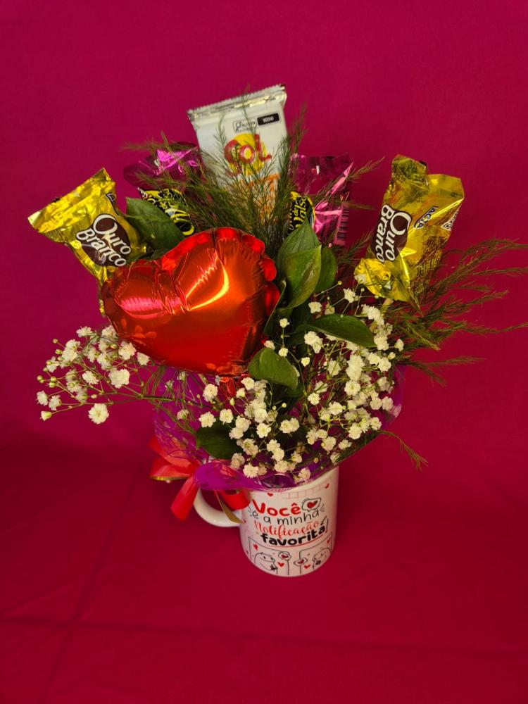 Xicara notificação favorita contendo 4 chocolates,1 biscoito, um balão de coração e arranjo de flores
