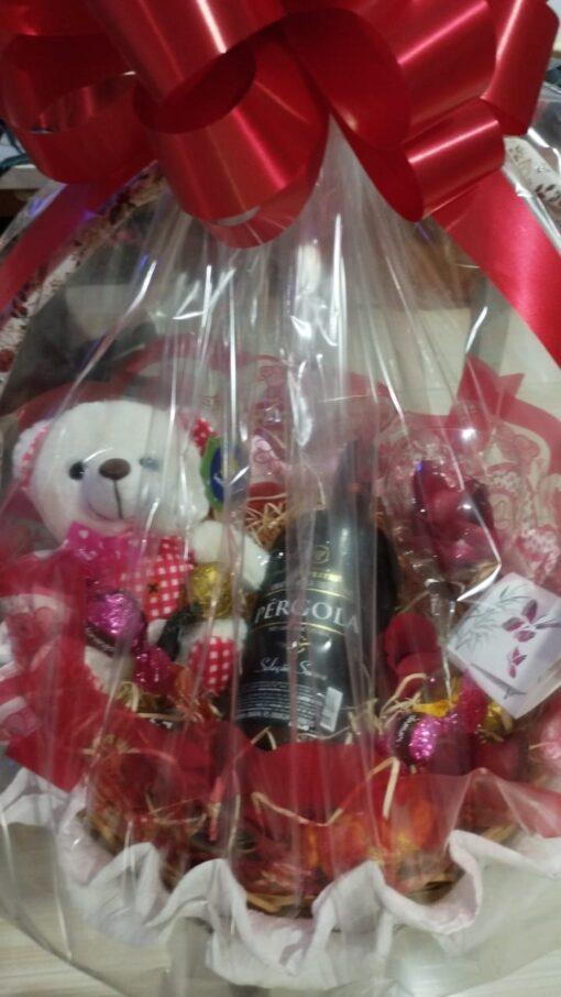 Caixa baú contendo: 1 orquídea Denphal mini, 1 caixa mini de chocolate de coração,1 urso de pelúcia, 2 sabonetes, 1 sabonete gel para o rosto e um creme para as mãos