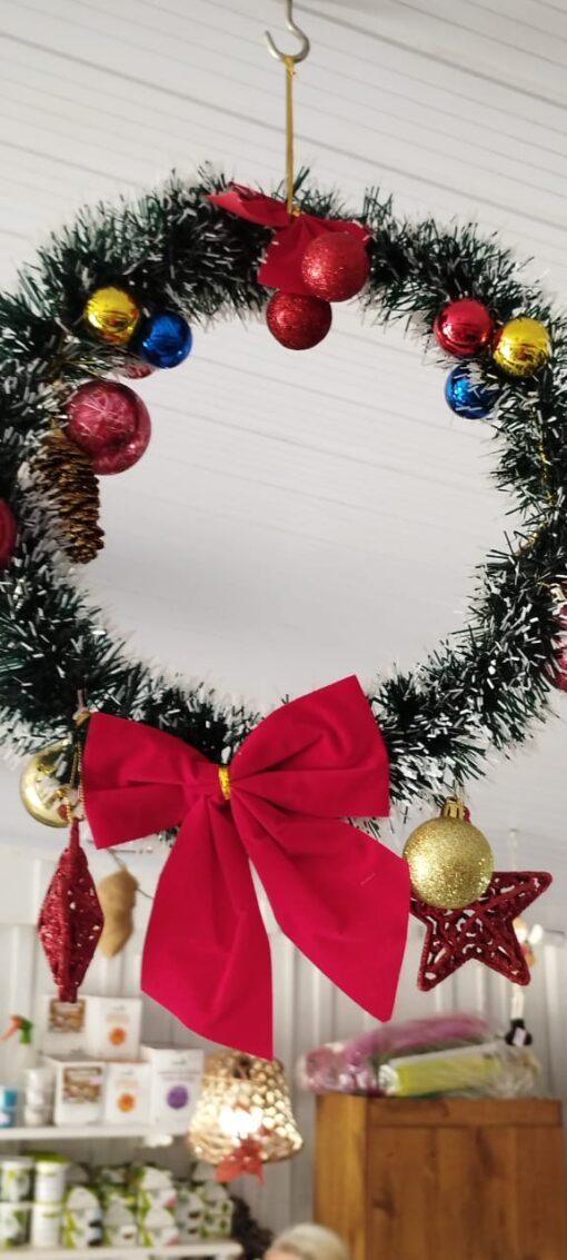 guirlanda decorada com laços e bolas decorativas, e estrelas com gliter, pronta para deixar sua casa linda.