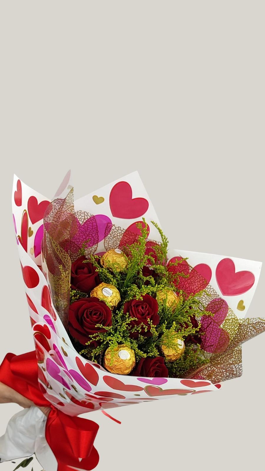 Buquê rosas vermelhas e chocolates Ferrero rocher