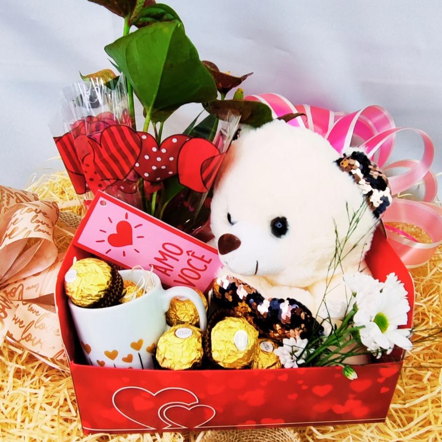 Cesta caixote tamanho M na cor vermelha, composta por um ursinho branco M, Uma xícara para café, um anturio vermelho mini e um cartão com a descrição amor você". Um presente perfeito para agradar a pessoa amada!