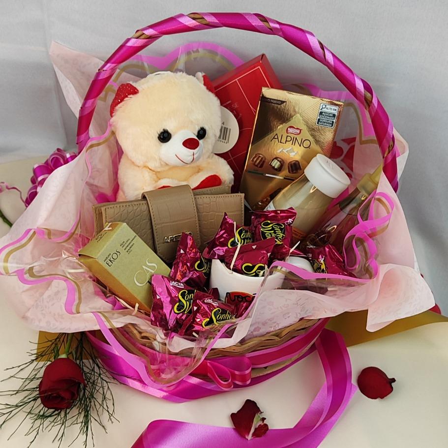 Esse é um daqueles presentes para impressionar, um belíssima cestas, contendo um kit cuide_se bem morango e leite do boticário; um chocolate alpino Nestlé 195 g; um sabonete líquido natura todo dia de 300 ml; um body splash macadamia natura 200 ml; um creme antirresecamento para as mãos 75g natura ekos; uma carteira feminina couro sintético marrom; um ursinho pelúcia com frase "te amo"; uma caneca porcelana com frase" você me faz feliz"; oito bombons sonho de valsa.