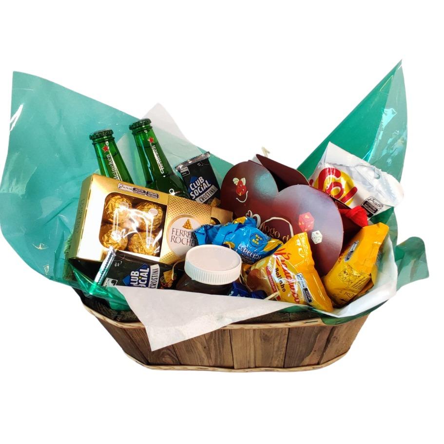 Cesta rústica composta por duas cervejas Heineken 250 ml; duas bolacha clube social Cristina 20 g; uma caixa Ferrero Rocher 100 g com 08 unidades; um creme avelã Nutella 140 g; um biscoito sol levianos 40 g; dois bolinho bauducco recheio chocolate 40 g; dois bombom beijinho; 03 chocolates bis; 01 caixa jogo da paixão para brincadeira a dois.
