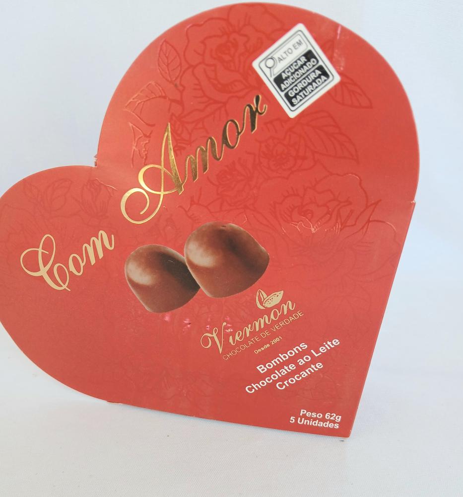 Embalagem delicada com o tema "com amor" co tem 05 bombons ao leite crocante, embalagem de 62 g.marca viermon