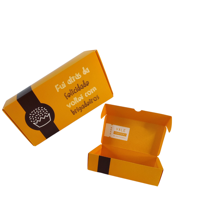 Caixas divertidas para 6 doces, com a temática 'fui atrás da felicidade e voltei com brigadeiros.