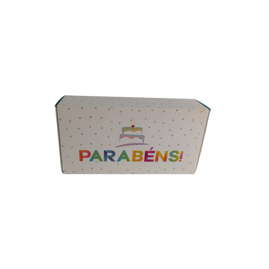 -Descrição: Caixa prática projetada para acomodar até 8 doces, apresentando um design vibrante e com a mensagem "Parabéns". Ideal para celebrações de aniversário e outras ocasiões festivas.
