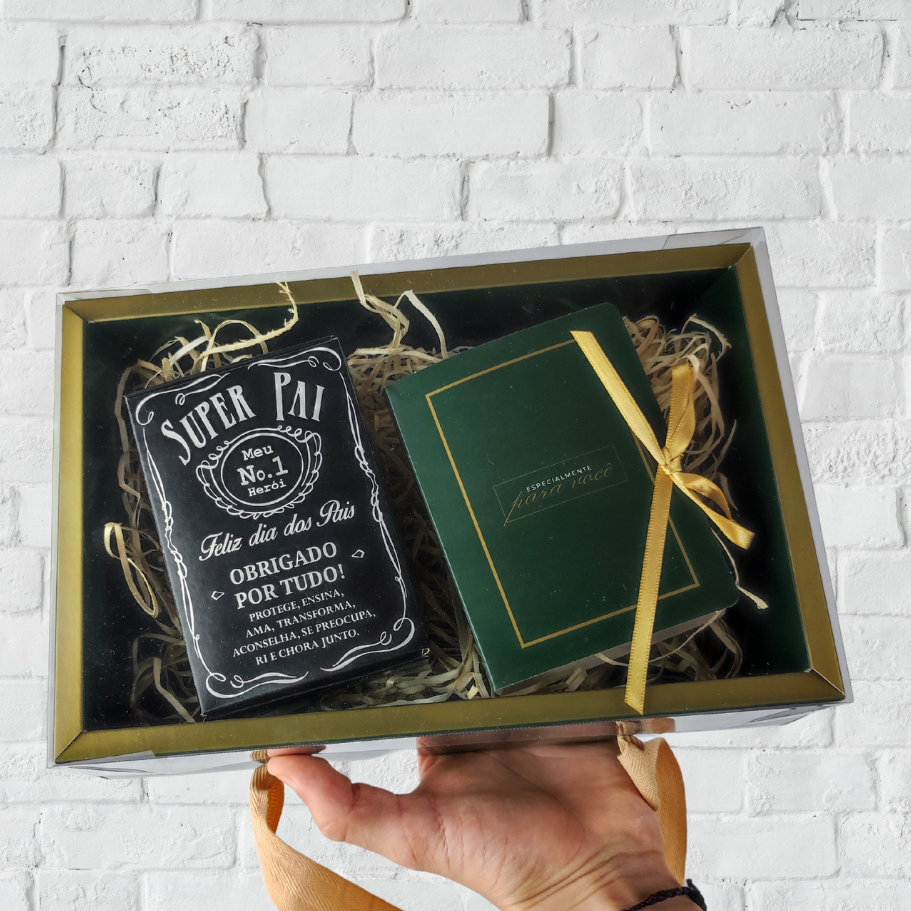 CAIXA GARRAFA com visor com a sequinte frase: ESPECIALMENTE PARA VOCE, contendo uma caixa super pai meu número 1, com 03 trufas brasil cacau sabores sortidos, mais caixa livro, especialmente pra você contendo um sabonete natura.