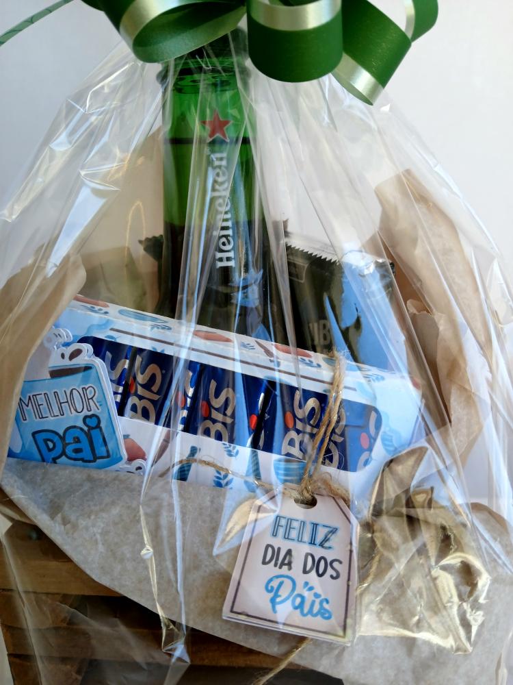 Caixa madeira contendo uma cerveja Heineken; duas bolachas clube social; 01 Caixa personalizada dia dos pais com 05 bis.