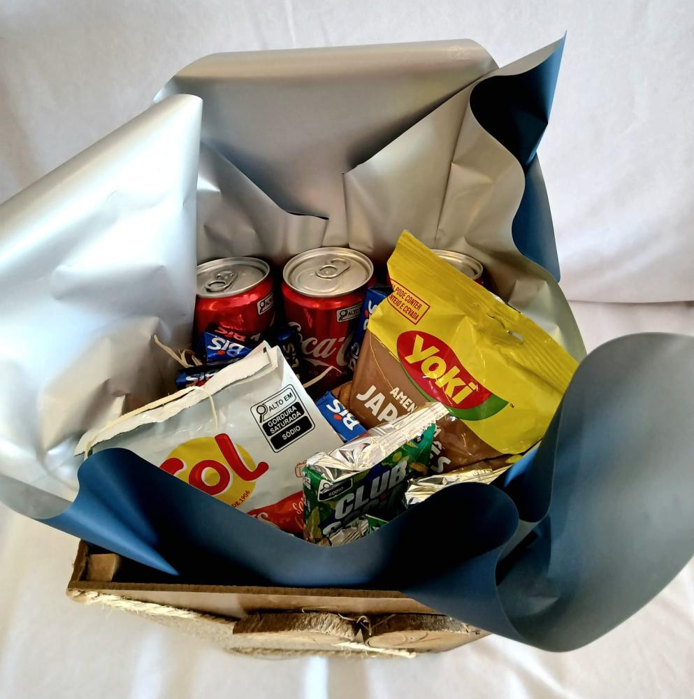 Cachepot madeira rústico contendo os sequintes itens: 03 coca cola lata 310 ml; 01 amendoim tipo japonês 150 g; 01 pacote de hits sabor queijo; 03 clube social sabor pizza; 05 chocolate bis.