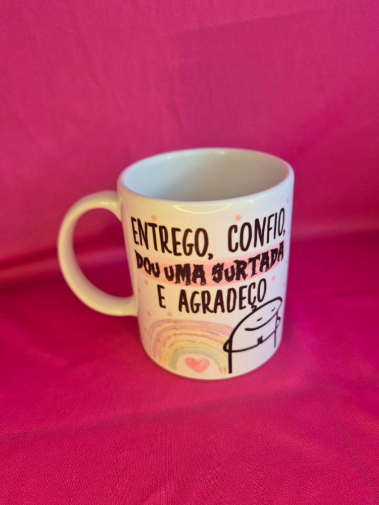 Xicara medindo 300ML,com a seguinte frase: Entrego, confio, DOU UMA SURTADA e agradeço.