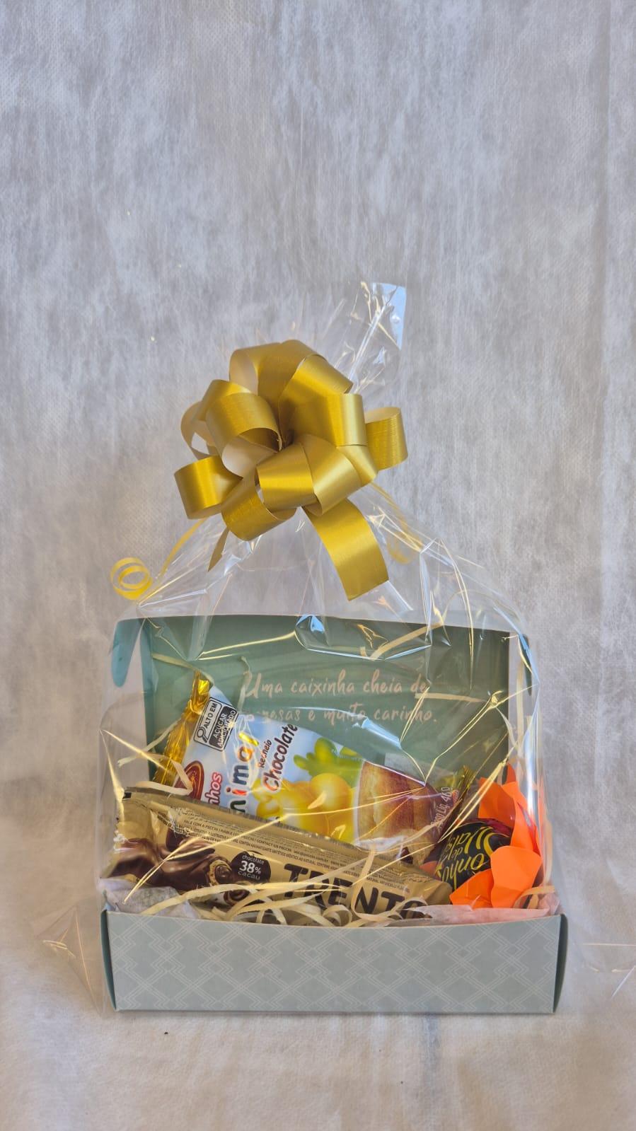 Caixinha surpresa contendo trento, um bolinho de chocolate e um bombom.